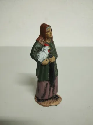 Figura artesanal para Belén de Navidad. Representa a una mujer mayor con un gallo blanco en brazos. - Detalle de vestimenta tradicional. - Base texturizada. - Figura de 12 cm.