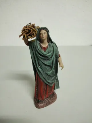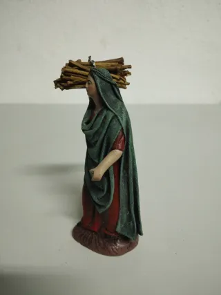 Figura artesanal para belén, representando a una mujer portando un haz de leña. - Detalle de vestimenta en tonos rojos y verdes. - Base texturizada. - Barro y trapo. - Figura de 12 / 13 cm.