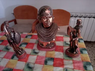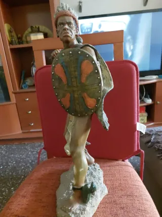Figura decorativa de un guerrero africano ZULU con lanza y escudo. 55 cm. Altura incluyendo la base. - Resina - Detalles muy realistas en la vestimenta y el cuerpo. - Base texturizada que simula roca. - En pierna derecha parte inferior presenta toques blanquecinos, no son defecto Viene así de fábrica en el momento de la compra habían 3 exactamente iguales