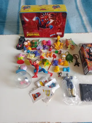 Pack de nostalgia con varios juguetes y figuras. - Lata metálica de Spiderman. - Figuras de Spiderman, Bob Esponja y otros personajes. - Coche de juguete. - Figuras de animales. - Llaveros. - Pegatinas Gogos - Figura de acción. - Street Fighter figura