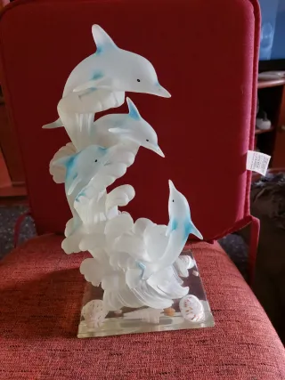 Preciosa figura decorativa de cuatro delfines saltando entre olas. 34 cm de altura - material de plástico rígido simulando cristal glasé - Base de plástico simulando cristal con conchas marinas.