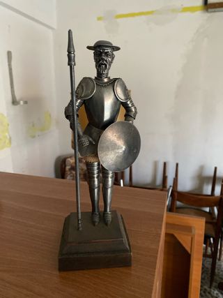 Figura decorativa de Don Quijote realizada en latón. - Representación del personaje con armadura. - Incluye lanza y escudo. - Base de soporte.