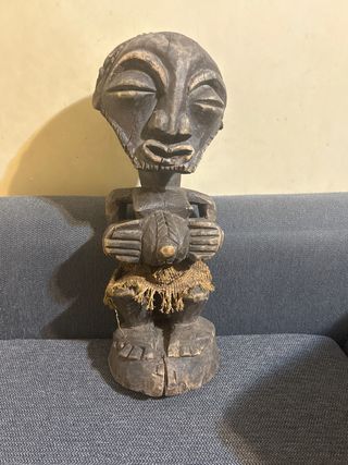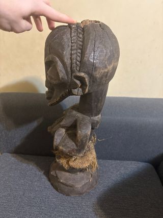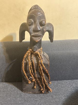 Escultura africana ritual tallada en madera, procedente del África central (zona Congo–Angola), adquirida en Sudáfrica hace unos 20 años. Figura antropomorfa de fuerte carácter expresivo, con cabeza de gran tamaño, ojos prominentes y orejas estilizadas. Conserva cuerdas originales de fibra vegetal anudadas al cuello y torso, elemento típico de objetos rituales o de poder simbólico. Presenta pátina natural, desgaste coherente con la edad y talla manual. Pieza del siglo XX, ideal para coleccionistas de arte africano o etnográfico.