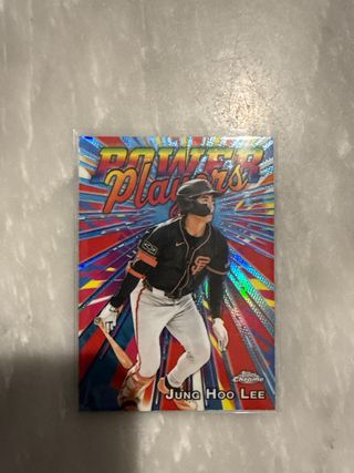 Tarjeta de béisbol Topps Chrome Power Players de Jung Hoo Lee. - Diseño llamativo con temática de Power Players. - Imagen del jugador en acción. - Marca Topps Chrome.