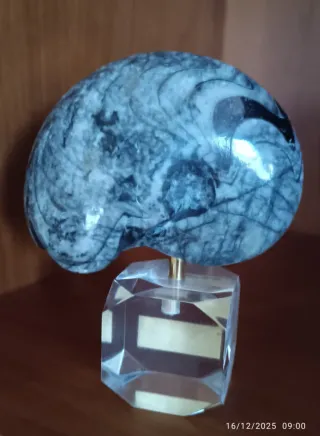 Fósil de Goniatites procedente de Marruecos, montado sobre una base de cristal facetado y un soporte metálico. - Fósil de molusco cefalópodo. - Patrón de vetas en tonos grises y blancos. - Base de cristal transparente.