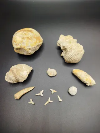 Conjunto de varios fósiles, incluyendo restos marinos y dientes. La gran mayoría son de diferentes puntos de España. - Fósil de bivalvo. - Fósil de gasterópodo. - Dientes de tiburón. - Fósil de erizo de mar. LOTE 0001