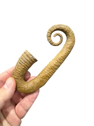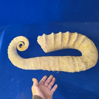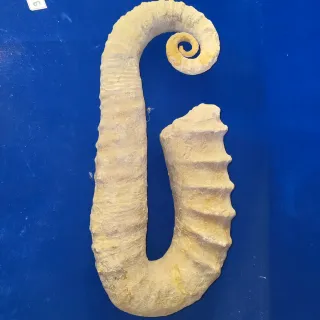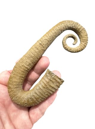 Pieza de fósil heteromorfo con una forma curva y espiralada. Presenta un patrón de costillas marcadas a lo largo de su estructura. 13 cm aproximados Un fósil heteromorfo se refiere principalmente a un ammonite (un cefalópodo extinto) cuya concha no sigue la espiral plana y regular típica, sino formas muy diversas y a menudo retorcidas, rectas o en forma de "clip" o "U", rompiendo con el patrón "planispiral" clásico. Son fósiles muy buscados y fascinantes por su morfología inusual ve-16
