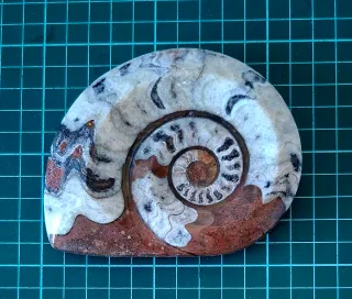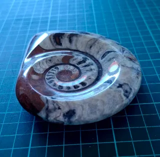 Este es un hermoso fósil de amonite pulido, una pieza única que muestra la belleza de la naturaleza. - Fósil de amonite. - Superficie pulida.
