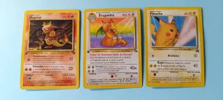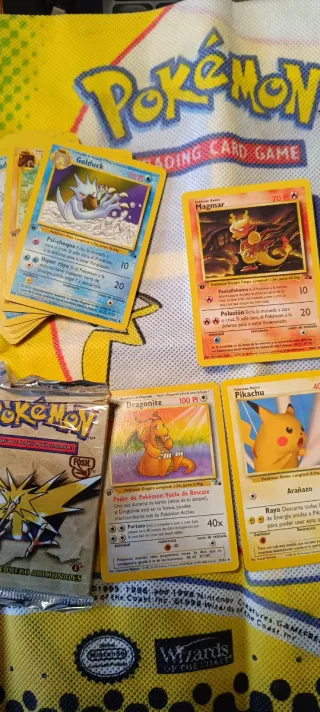 Tapete original + cartas Pokémon de la primera generación, con temática de la expansión Fósil. Ideal para coleccionistas. Todo valorado en 180 euros. Precio de venta 150. No se vende por separado. No se cambia. - Incluye cartas como, Magmar (20), Dragonite (70 euros perfecto estado) y Pikachu (20 euros por el estado. Es la única carta con signos de doblez), el resto de cartas valoradas entre 3 y 5 euros. - Tapete sin usar (40 euros) muestra el logo de Nintendo y Wizards of the Coast. Está decorado con el logo de Pokémon y Pikachu.