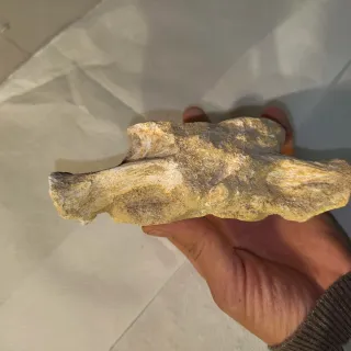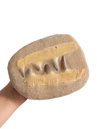 Pieza de fósil de hueso, con textura y coloración únicas. - Forma irregular. - Textura rugosa. - Coloración amarillenta y marrón.