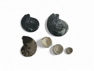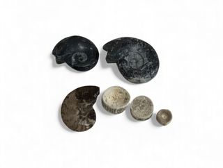 Conjunto de fósiles de ammonites y vértebras. Amonites cm : 4 cm - 4,5 cm - 5 cm Vértebras cm : 1,5 cm - 2 cm - 3 cm - Piezas de origen natural. - Variedad de tamaños y formas. Azul CC-5