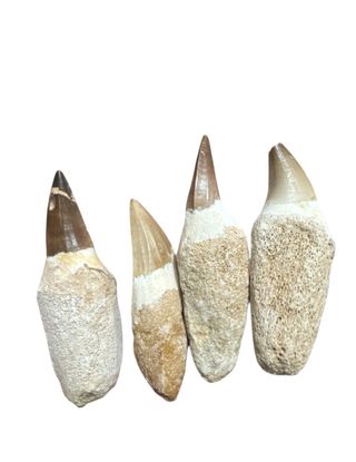 Conjunto de cuatro dientes fósiles de mosasaurio. Piezas únicas para coleccionistas. 7 cm 7,5 cm 7,5 cm 8 cm - Auténticos fósiles. - Procedencia: Marruecos. Azul -CC-6