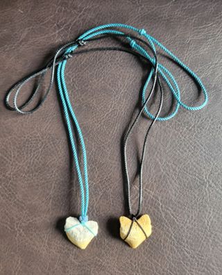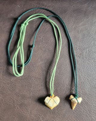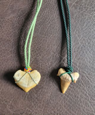 Conjunto de dos collares con dientes de tiburón Squalicorax. Elige los 2 que mas te gusten. Cada uno con su bolsita y certificado de autenticidad Increible y unico collar autentico de Squalicorax con más 95 Millones de años. Regalo prefecto para amantes de los fosiles, donosaurios y piezas especiales Precio por unidad. elige el tuyo. El Squalicorax se extinguió al final del Cretácico, como consecuencia del evento de extinción masiva de hace 66 millones de años. Mas fosiles y dinosaurios en mi perfil
