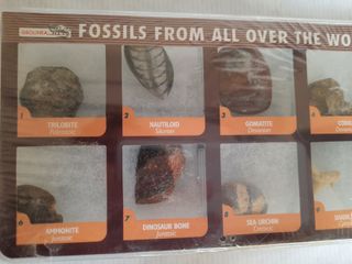 Expositor con 10 fósiles etiquetados con su nombre y periodo. Un aprendizaje fantástico para los pequeños de la casa para conocer cómo era la vida de los animales y las plantas en La Tierra hace millones de años. +8 años. GED19. HAGO ENVIOS walladu
