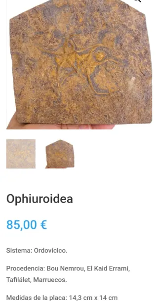 🦕 Fósil auténtico de estrella frágil (Ophiuroideo) – Ordovícico (~450 millones de años) Vendo fósil original de Ophiuroidea (estrella frágil) procedente de Bou Nemrou, El Kaid Errami, Tafilált, Marruecos. • Edad: Ordovícico (aprox. 450 millones de años). • Pieza única, completamente auténtica. • Ideal tanto para colección como para decoración exclusiva. 📌 El fósil se encuentra en perfecto estado de conservación. Puedo enviar fotos adicionales o vídeos para comprobar la autenticidad. 💸 Entrega en mano en Madrid centro o envío seguro bien protegido. Tags: trilobites ammonites ammonite jurassic