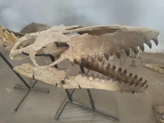 Réplica de un cráneo de dinosaurio, ideal para coleccionistas o exhibición. - Réplica detallada de un cráneo de dinosaurio. - Montado sobre soportes para exhibición.