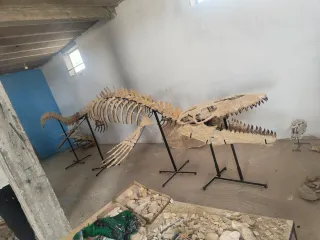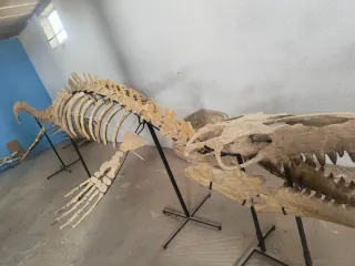 Espectacular esqueleto fósil de un reptil marino prehistórico, ideal para coleccionistas o museos. - Réplica detallada de un fósil. - Montado sobre soportes para exhibición.