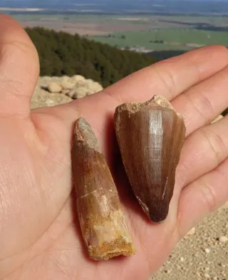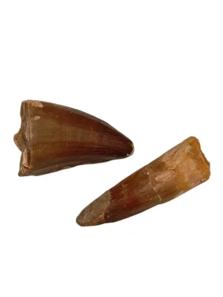 Dos dient.fósiles naturales de Spinosaurus y Mosasaurus. -en bien estado de conversación,piezas autenticas Fosilizadas. Medidas 4,5 cm y 5 cm. Wvspino45