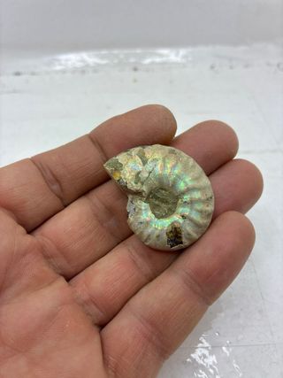 Este fósil de amonites presenta un hermoso brillo nacarado que refleja la luz con tonos iridiscentes. - Fósil de amonites. - Acabado nacarado.