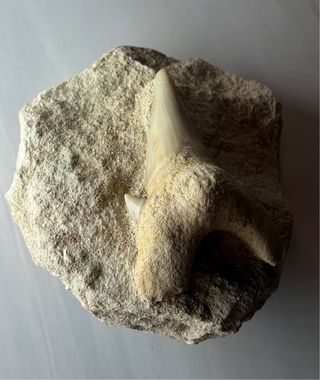 Pieza espectacular! Magnífico diente de tiburón prehistórico Otodus obliquus (ancestro directo del Megalodón). El diente está todavía parcialmente incrustado en su matriz original de roca caliza/fosfatos. • Estado: Excelente. Como se ve en las fotos, el esmalte tiene un color crema precioso y una preservación increíble. • Detalle: Se aprecian perfectamente las cúspides laterales y la robustez de la raíz. • Antigüedad: Aproximadamente 50 millones de años. • Coleccionismo: Una pieza de historia natural ideal para decorar o regalar. Se envía muy protegido en caja rígida para evitar daños en el esmalte o la matriz.