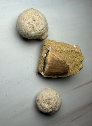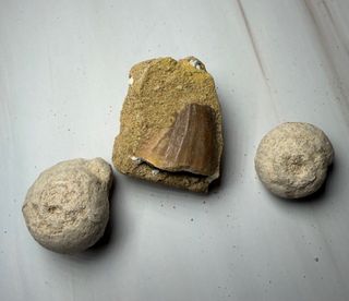 Lote 3 Fósiles: Diente Mosasaurio y Caracoles