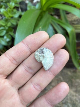 Fósil de amonite con un hermoso brillo nacarado. Una pieza única para coleccionistas. - Auténtico fósil de amonite. - Presenta iridiscencia nacarada.