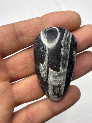Fósil de ortoceras con un diseño natural y atractivo. La pieza muestra la estructura interna del fósil. - Color principal negro con vetas blancas. - Forma alargada y pulida.