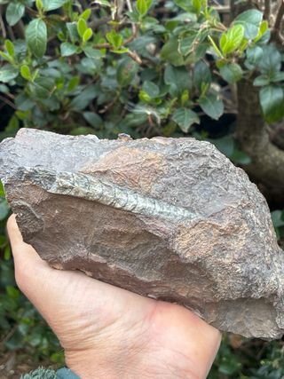 Fosil de ortoceras de gran tamaño, una criatura marina extinta. - Pieza única con detalles geológicos. - Textura rugosa y colores terrosos.