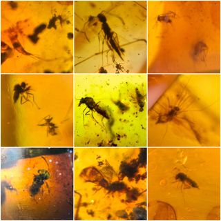 Lote de 17 piezas de ámbar fósil con insectos e inclusiones del Cretácico (Cenomaniense, hace 99 millones de años, época de los dinosaurios), totalmente auténticas y procedentes de Birmania. El precio es por todas las piezas de las fotos. Los insectos son principalmente dípteros, principalmente moscas y mosquitos, incluye un escaso y extinto Aenictopecheidae, todas las piezas revisadas personalmente en microscopio y pulidas para su correcta observación. Perfectas para coleccionismo, joyería o hacer colgantes. Se aceptan envíos y recogida en mano (precio negociable si se recoge en mano)