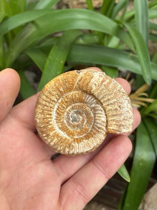 Impresionante fósil de amonite con espiral perfectamente definida y detalles naturales visibles en su estructura interna. Una pieza con millones de años de historia, ideal para amantes de la paleontología, coleccionistas o como elemento decorativo con carácter y personalidad. ✨ Características: Tipo: Fósil de amonite natural Color: Tonos tierra, beige y marrón con vetas naturales Estado: Buena conservación