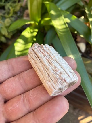 Pieza de madera petrificada, un fósil xilopalo con detalles únicos. - Textura y patrones de madera preservados. - Tonos marrones y blancos. - Ideal para coleccionistas.