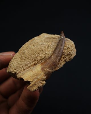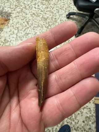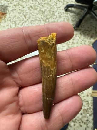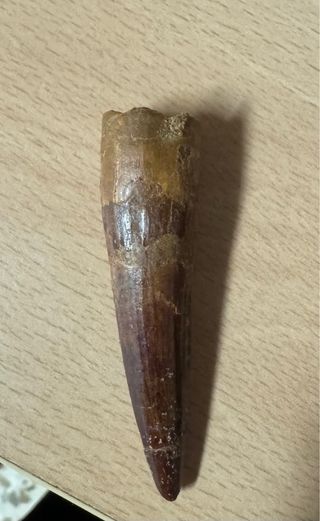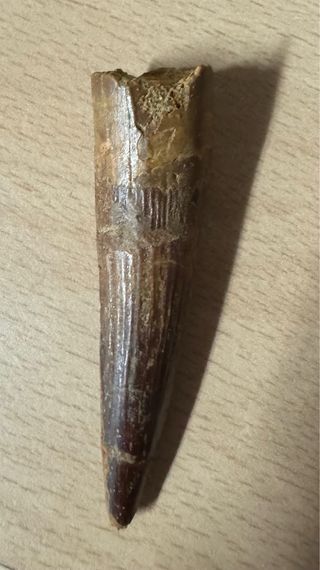 Magnífico y original Diente fósil spinosaurus aegyptiacus de 5,5cm. REAL, no reproducción ni copia. En muy buen estado. Diente de una pieza. Del cretácico superior (96 millones de años aprox.) Del Sur de Marruecos Entrego con copia de certificado de autenticidad (el certificado original es de 3 dientes y me lo quedo) Comprado en Catawiki, lo que ofrece total garantía de ser verdadero