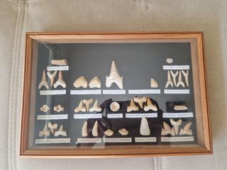 Colección de fósiles de dientes de tiburón y otros animales marinos prehistóricos, presentados en un marco. - Dientes de Carcharías Africana. - Dientes de Squalicorax Pristodontus. - Dientes de Otodus Obliquus. - Dientes de Mosasaurus Leidon Anceps. - Dientes de Serratolamna. - Dientes de Cretolamna. - Dientes de Rhombodus. - Dientes de Myliobatis. - Dientes de Phyllodus. - Vertebrae. - Dientes de Pristis. Precio NO NEGOCIABLE