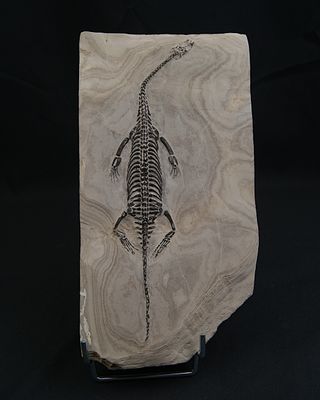 Fósil de Keichosaurus, un reptil marino prehistórico. - Detalle del esqueleto completo.