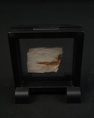 Pez fósil en matriz Actinopterygii de 4 cm. Mioceno. Muy frágil, protegido con B72. Procedente de Francia. Incluye marco 3D. - Fósil de pez. - Conservado en matriz. SKU:2320