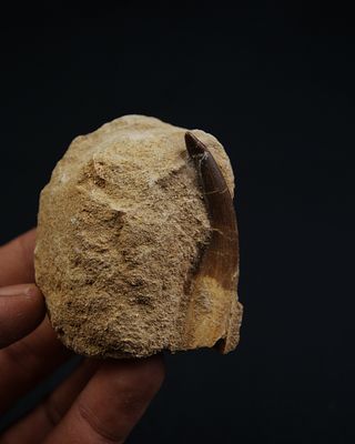 fosil de Mosasaurus globidens de 7.7 cm. Forma de seta. En matriz natural. Consolidado. Marruecos. SKU:2391