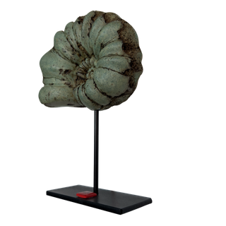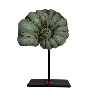 Amonita – Réplica artesanal en resina de poliuretano en tonos verdes. Reproducción artesanal de una amonita fósil, creada en resina de poliuretano envejecida a mano. Cada detalle, desde las texturas hasta los matices del color, están trabajados cuidadosamente para reflejar la belleza natural y el paso del tiempo. - Detalles del producto: - Material: resina de poliuretano. - Acabado: pintado y envejecido a mano. - Dimensiones aproximadas: 26cm de alto x 18cm de ancho y unos 6cm de grosor. - Soporte metálico incluido. - Pieza única, firmada por el artista. - Ideal para coleccionistas, museos o decoración.