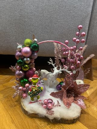 Original adorno navideño con temática invernal. - Figura del Grinch con un regalo. - Figura de reno blanco. - Base de madera con nieve artificial. - Decoración con esferas y flores rosas. Con opción de incluir luces