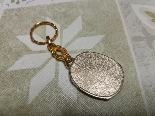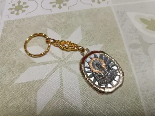 Llavero con la imagen de la Virgen del Pilar de Zaragoza. - Diseño ovalado con detalles dorados y plateados. - Borde con acabado en color rojizo. - Cadena y anilla doradas.