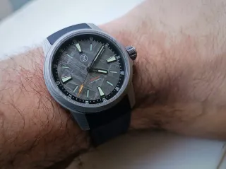 Relo automáticoj Zelos Aurora Field de 38 mm con esfera de Damasco. El acero de Damasco se produce mediante una antigua técnica de forjado de cuchillos para crear un hermoso patrón y una mayor dureza. Esto se logra mediante múltiples capas de acero forjadas y retorcidas a altas temperaturas para lograr estos patrones únicos, sin que haya dos piezas iguales. Este exclusivo Zelos Aurora cuenta con una esfera de meteorito y caja de acero damasco inoxidable.