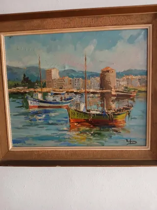 Antiguo cuadro al óleo que representa una escena portuaria con barcos. La población es Salou el total del cuadro 75×65 cm. - Pintura al óleo. - Marco de madera con detalles. - Firma del artista Robira visible.