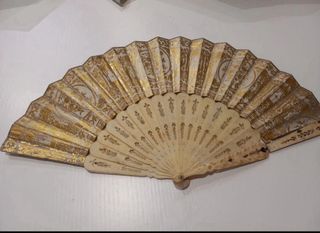 Precioso abanico antiguo finales s.XIX con escena pintada y detalles dorados. Ideal para coleccionistas o como pieza decorativa. - Pintura de escena campestre con figuras. - Varillas de hueso o similar con calados y detalles. - Guardas doradas con motivos vegetales. - Requiere restauración.