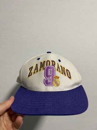 Gorra conmemorativa de Iván Zamorano y el Real Madrid. - Color blanco y morado. - Número 9 bordado. - Escudo del Real Madrid.