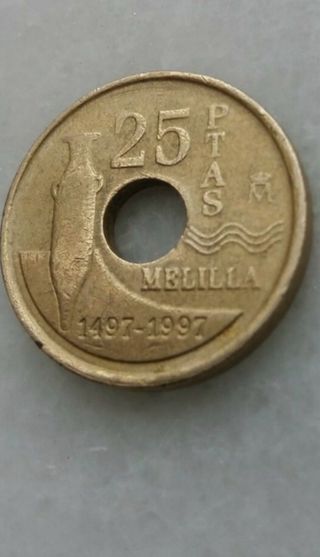 Moneda conmemorativa de 25 pesetas de Melilla. - Año: 1497-1997 - Diseño con agujero central. - Inscripción MELILLA y 25 PTAS.