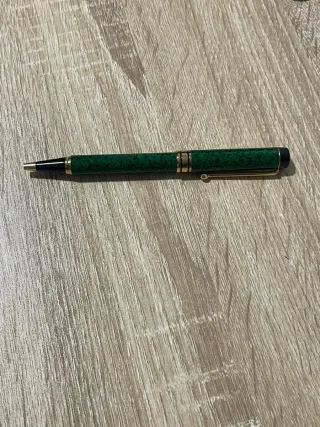 Elegante bolígrafo con un diseño de resina en color verde y detalles en oro. - Cuerpo de resina con patrón veteado. - Adornos y clip chapados en oro.