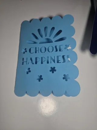 Postal decorativa con el mensaje Choose Happiness y un diseño de sol naciente y flores. -Postal personalidad - Color azul claro.