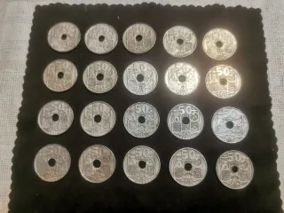 Lote de monedas de 50 céntimos. - Diseño con agujero central. - Grabado de escudo y detalles. - Valor facial de 50 céntimos.