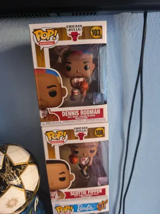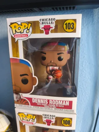 -Cada una 20 € -Los dos juntos 35 € Dos figuras Funko Pop! de jugadores de baloncesto de los Chicago Bulls. - Figura de Dennis Rodman, número 103. - Figura de Scottie Pippen, número 108.