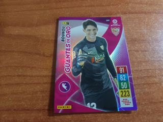 Tarjeta de colección GUANTES DE ORO de la temporada 2021-2022.ADRENALYX - Edición: Guantes de Oro. - Puntos: 90 (portería), 81 (reflejos), 50 (uno contra uno), 221 (total). - Serie: LaLiga Santander. - Marca: Panini.