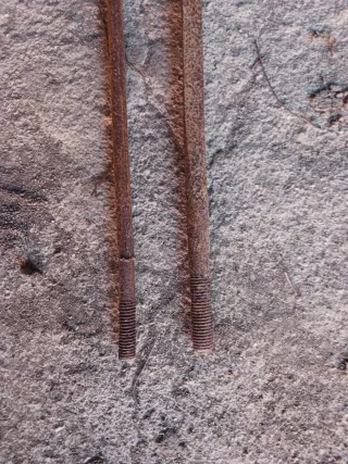 Se venden dos tornillos antiguos de gran tamaño, cada uno superando el metro de longitud. Son piezas únicas con un aspecto rústico. - Longitud aproximada: más de 1 metro cada uno. - Material: Metal (apariencia antigua). - Cantidad: 2 unidades.